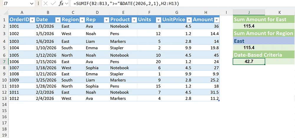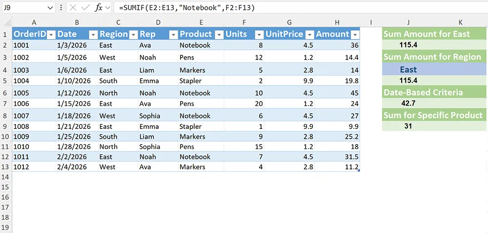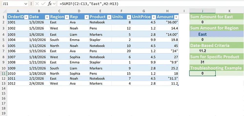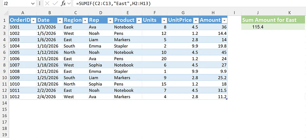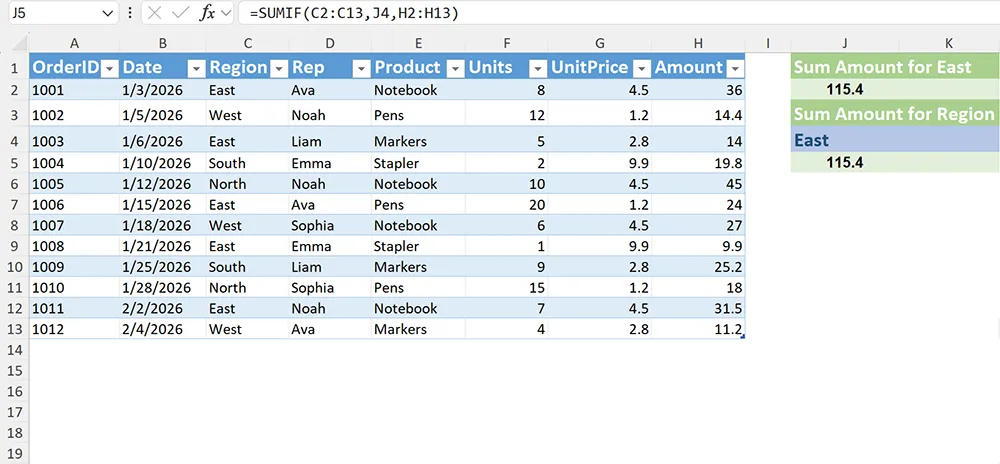How it works: SUMIF checks each cell in C2:C13 (Region). When it equals “East”, it adds the corresponding value from H2:H13 (Amount) to the total.